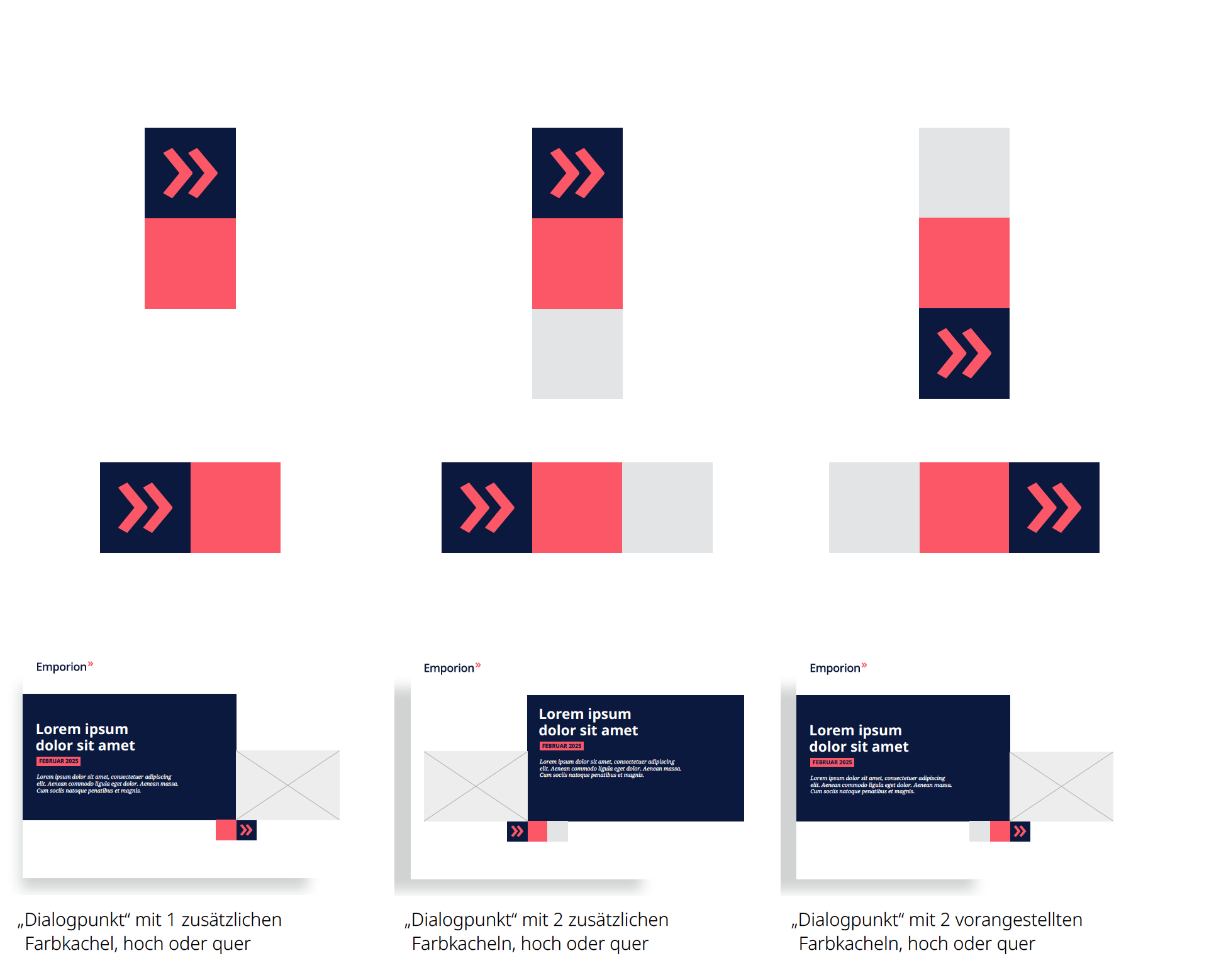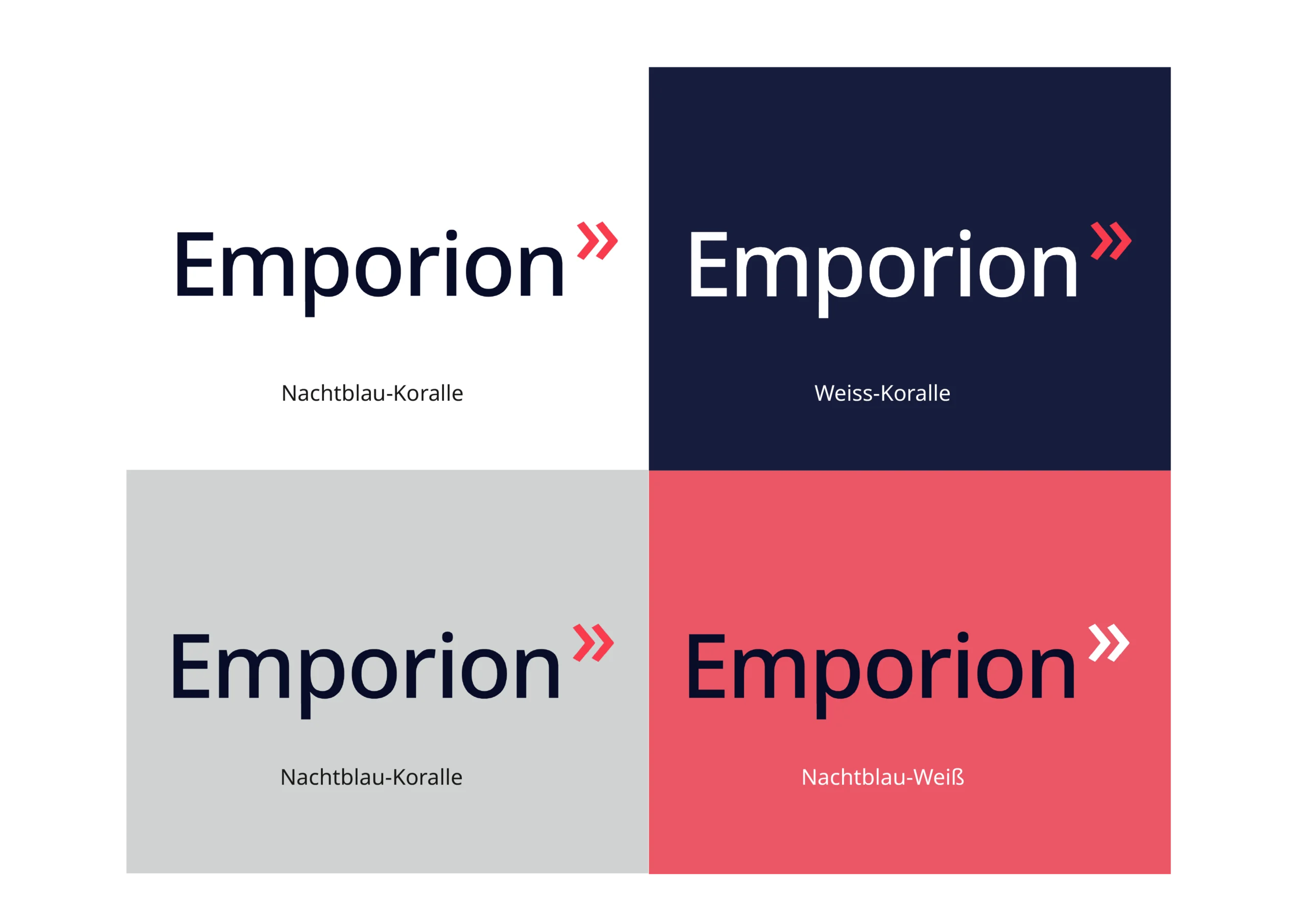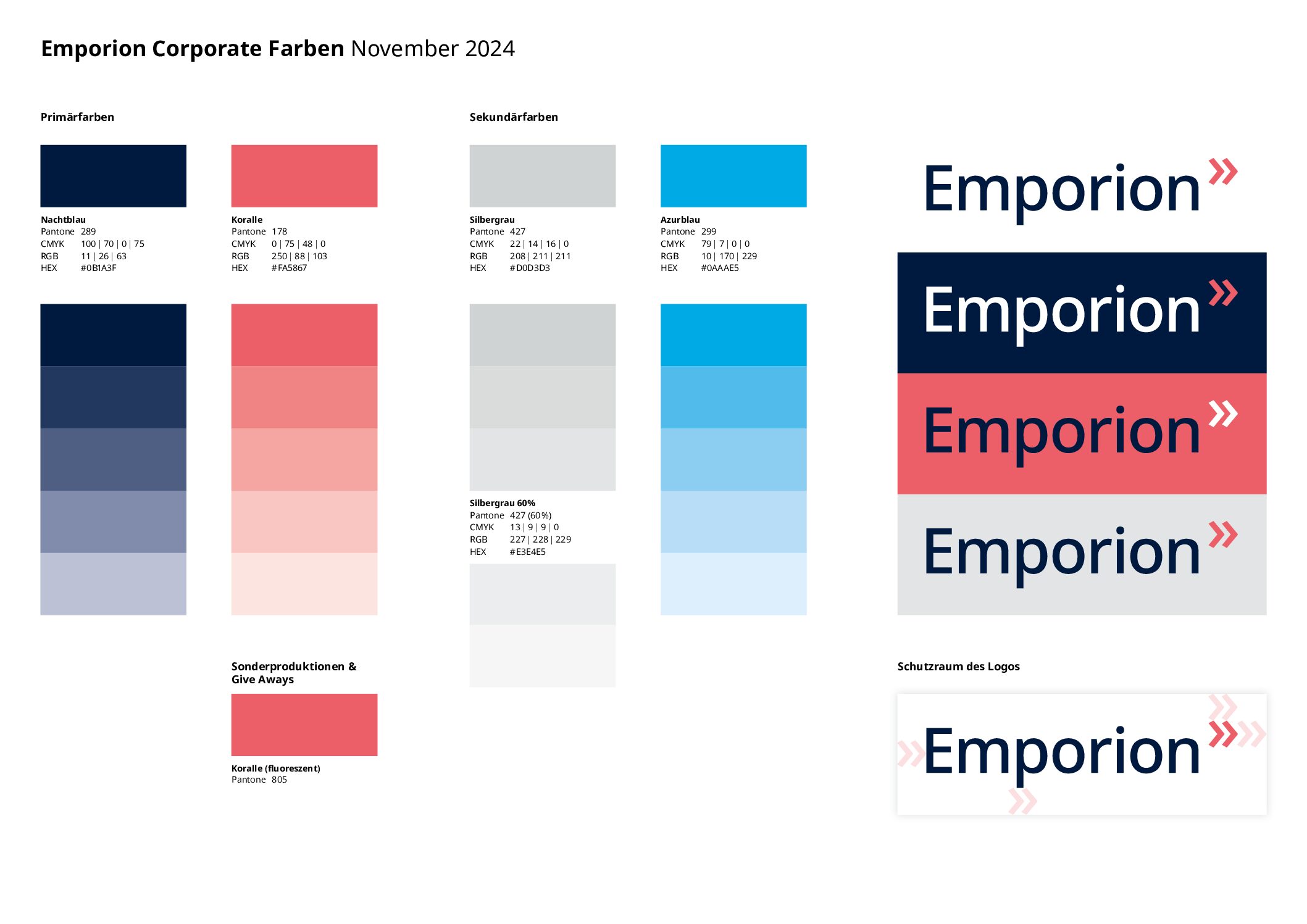 Die Primärfarben, also die wichtigsten Farben im Emporion-Erscheinungsbild, sind „Nachtblau“, „Koralle“ und Weiß. Ergänzt werden sie durch die Sekundärfarben „Silbergrau“ und „Azurblau“. Alle Farben symbolisieren positive Eigenschaften und leiten sich aus den Unternehmenwerten ab.