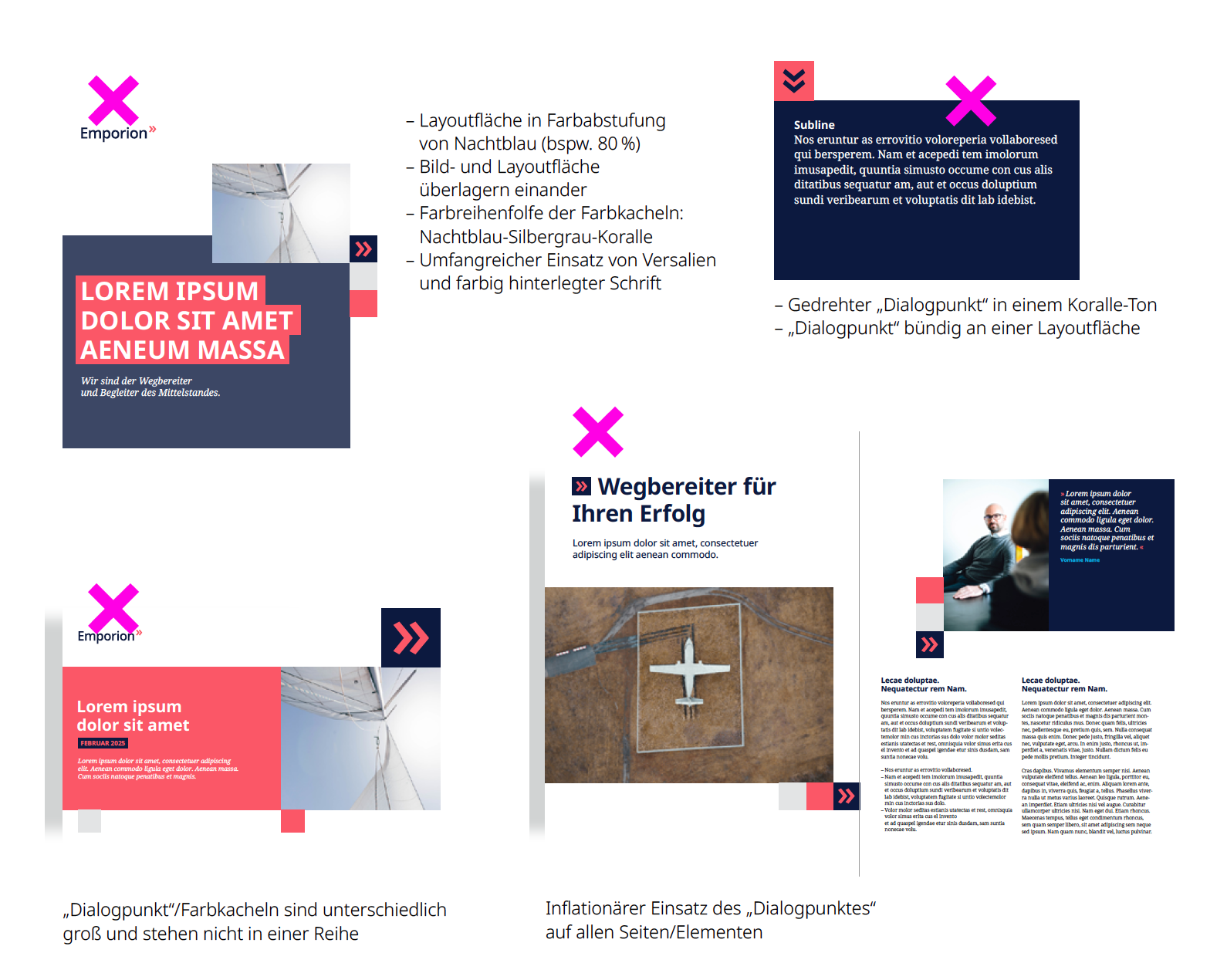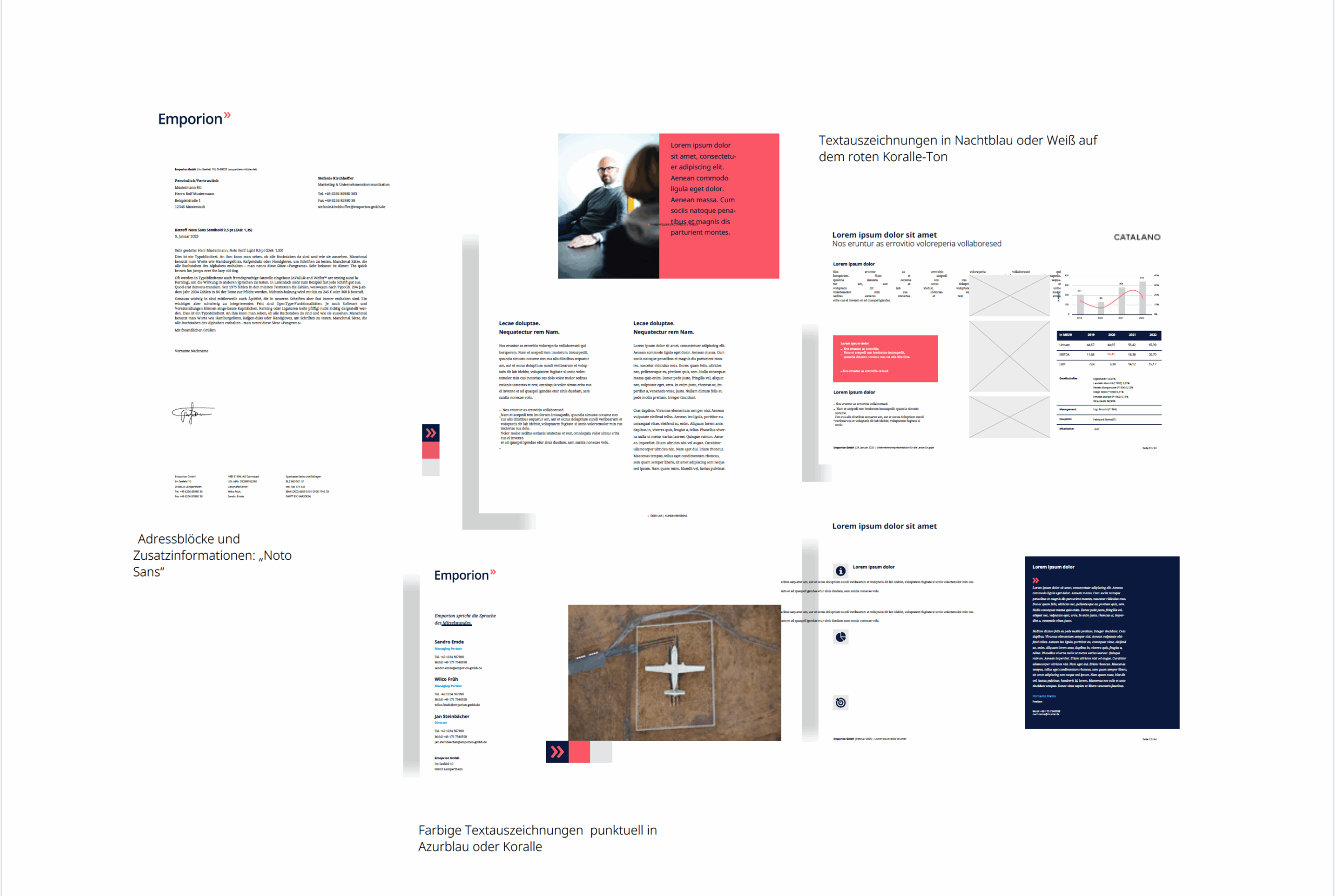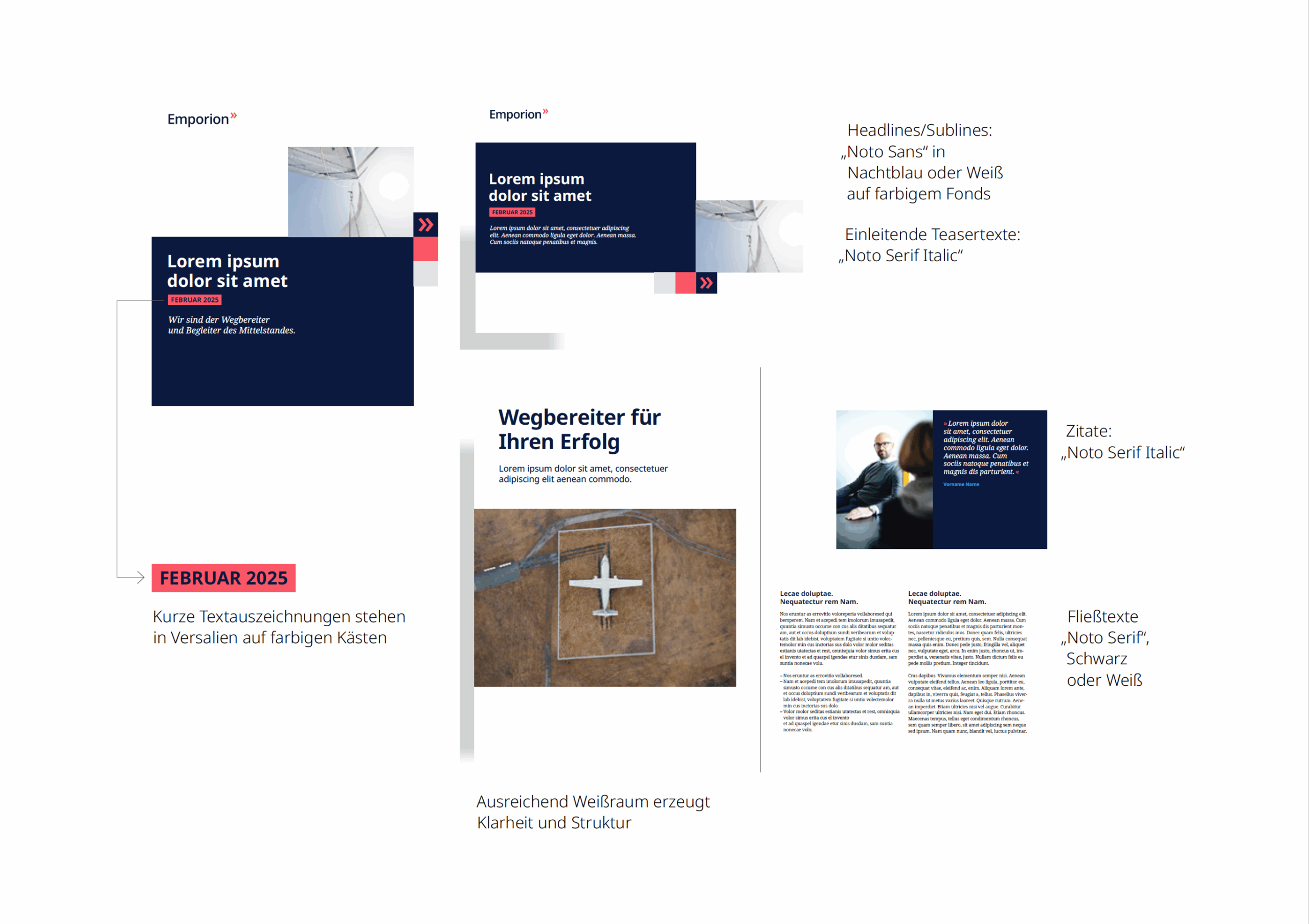 Emporion setzt auf eine sorgfältig abgestimmte Schriftmischung der sehr gut ausgebauten Schriftfamilie „Noto“. Sie spiegelt aufgrund ihrer vielseitigen Einsatzmöglichkeiten den Markencharakter „intelligent, zuverlässig, kompetent“ wider.