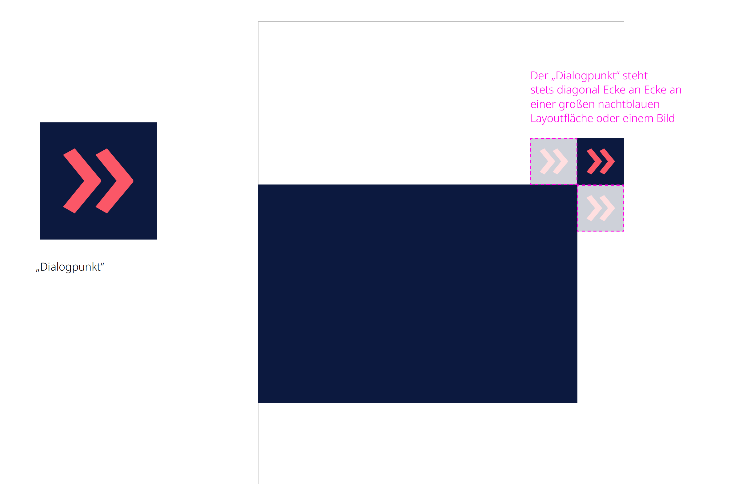 Als Partner mit Expertise agieren sie auf Augenhöhe mit ihren Kunden. Der „Dialogpunkt“ symbolisiert den Beginn eines offenen Dialoges. Er ist Inspiration und Impuls zugleich. Er gibt Orientierung und ist richtungs-weisend – somit unterstreicht der „Dialogpunkt“ die Markenwerte „inspirierend, intelligent und selbstbewusst“. Der „Dialogpunkt“ darf nicht gedreht werden. Er zeigt stets in Leserichtung nach rechts – nach vorn.