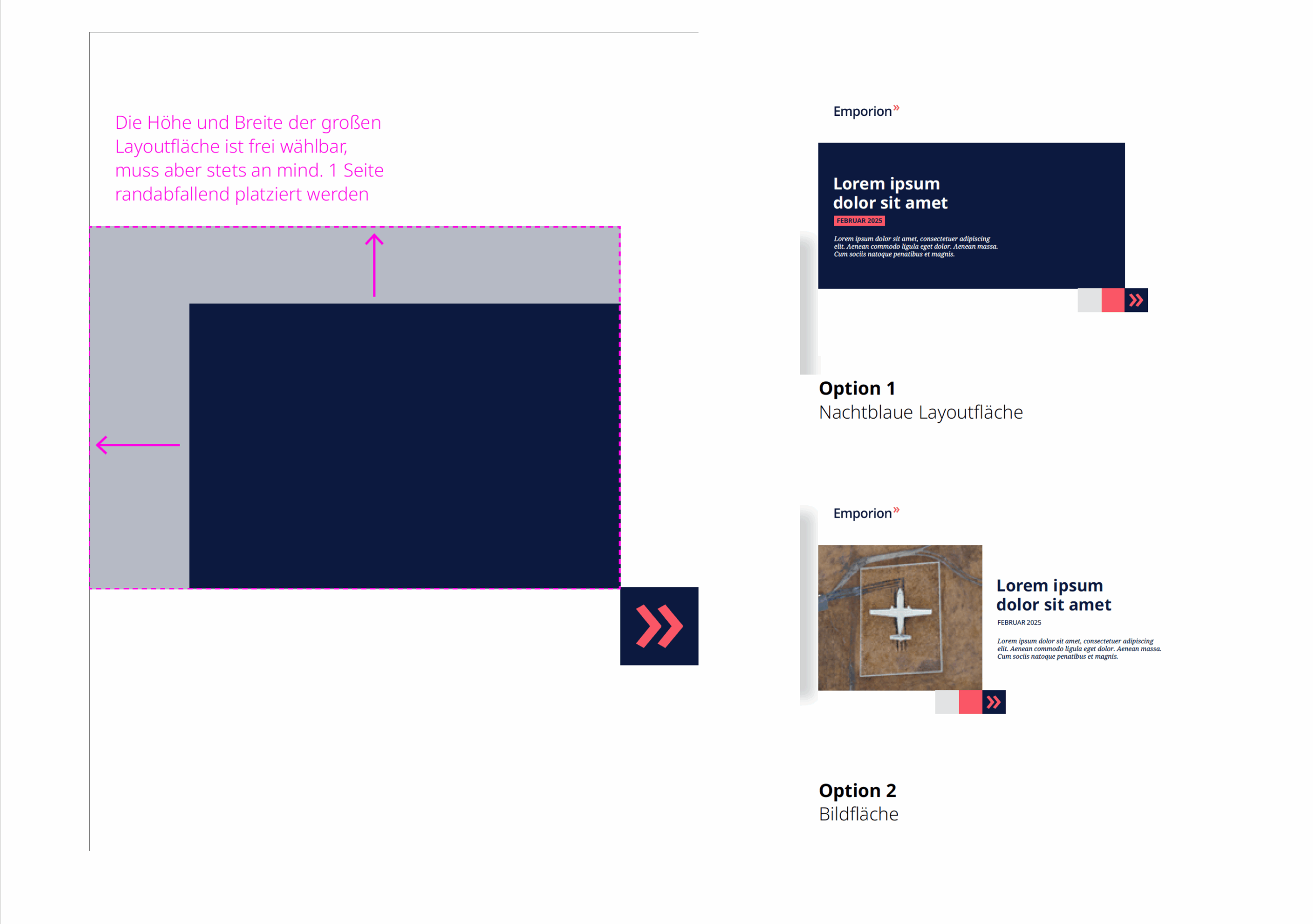 Diagonal aus der Ecke des „Dialogpunktes“ wird die große Layoutfläche aufgezogen. Die Höhe und Breite ist frei wählbar, muss aber stets an mind. 1 Seite randabfallend platziert werden. Hierbei bestehen zwei Layoutoptionen:
