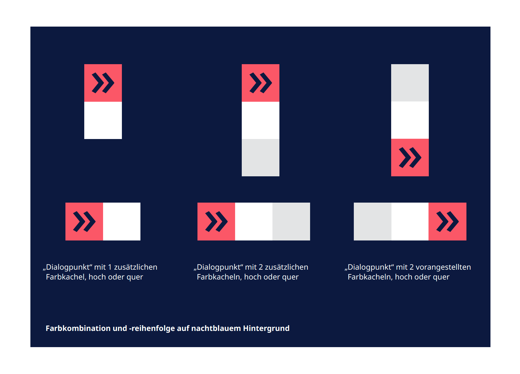 Der „Dialogpunkt“ kann um 1 bis max. 2 Farbkacheln erweitert werden. Diese sind stets gleich groß und stehen immer bündig in einer Reihe – horizontal oder vertikal. Die Farben und ihre Farbreihenfolge sind fest vorgeben. Die Position des „Dialogpunktes“ kann wie abgebildet variieren. Der „Dialogpunkt“ darf nicht gedreht werden. Er zeigt stets in Leserichtung nach rechts. Die Farbkacheln sollten innerhalb einer Anwendung oder einer Formatgröße stets gleich groß sein – bei dem DIN A4 Querformat ist die Kachelgröße 18 × 18 mm.