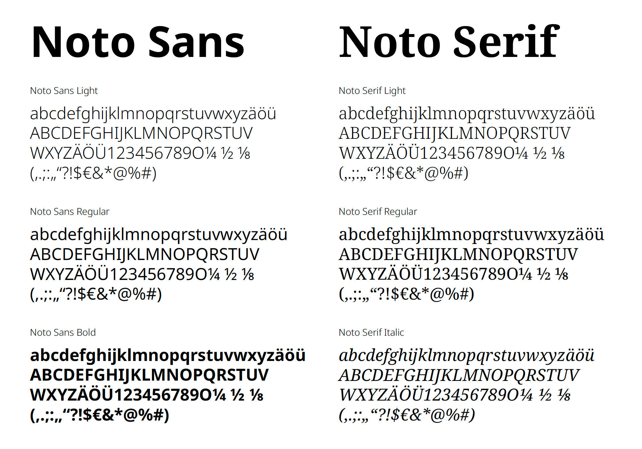 Für alle besonderen Auszeichnungen wie Headlines, Sublines, Zusatzinformationen und Bildunterschriften wird die „Noto Sans“ verwendet, für alle weiteren Inhalte wie Fließtexte oder Zitate kommt die „Noto Serif“ zum Einsatz.