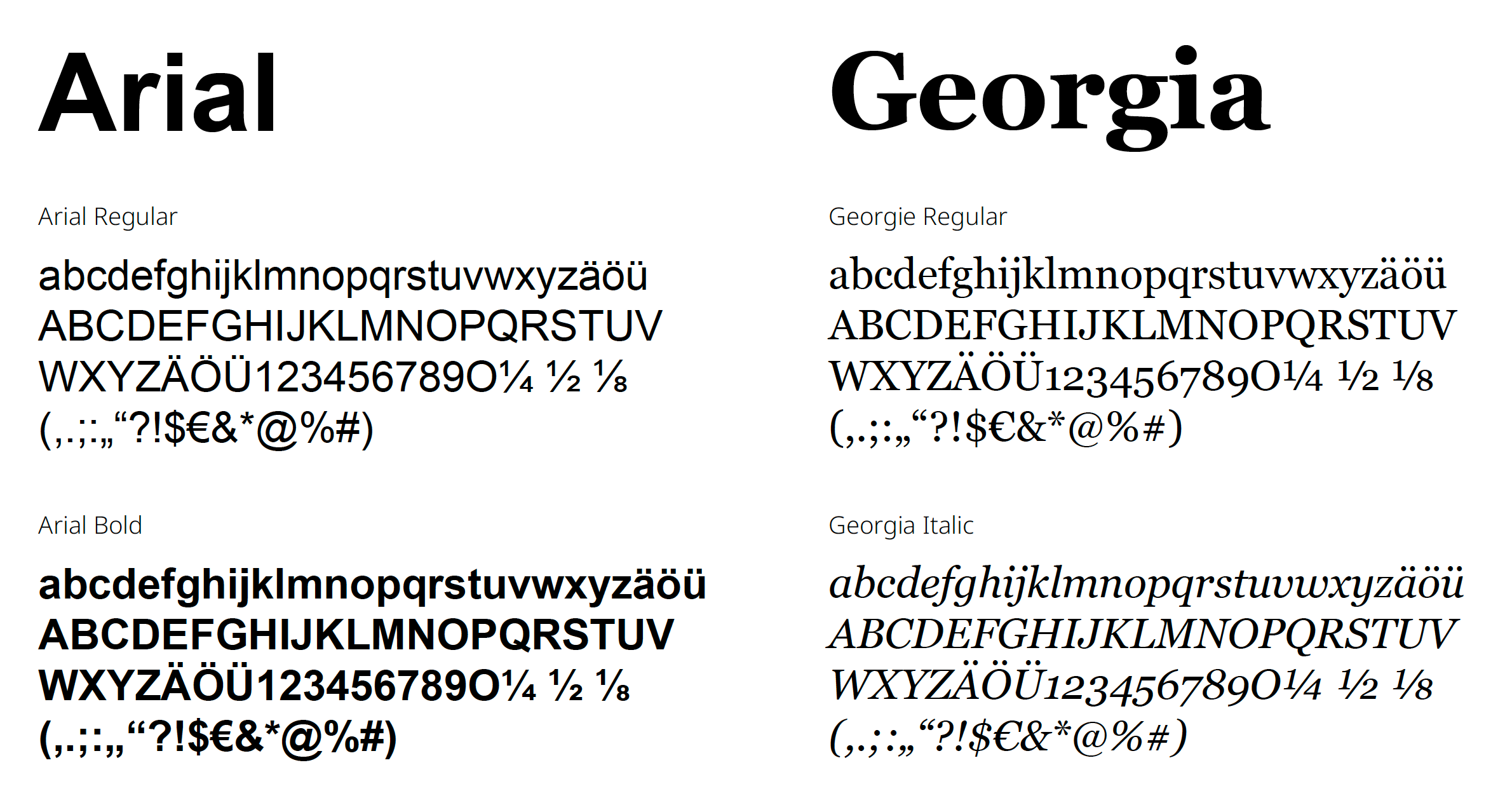 Wenn bspw. aus technischen Gründen die Verwendung der Schrift „Noto“ nicht möglich ist, darf auf die „Arial“ (für Headlines) bzw. die „Georgia“ (für Fließtexte) zurückgegriffen werden. Sowohl „Arial“ als auch „Georgia“ sind System schriften und auf beiden Betriebssystemen (PC/Mac) gleichermaßen verfügbar. Der Einsatz der Hausschriften „Noto Sans & Noto Serif“ ist jedoch stets zu bevorzugen.