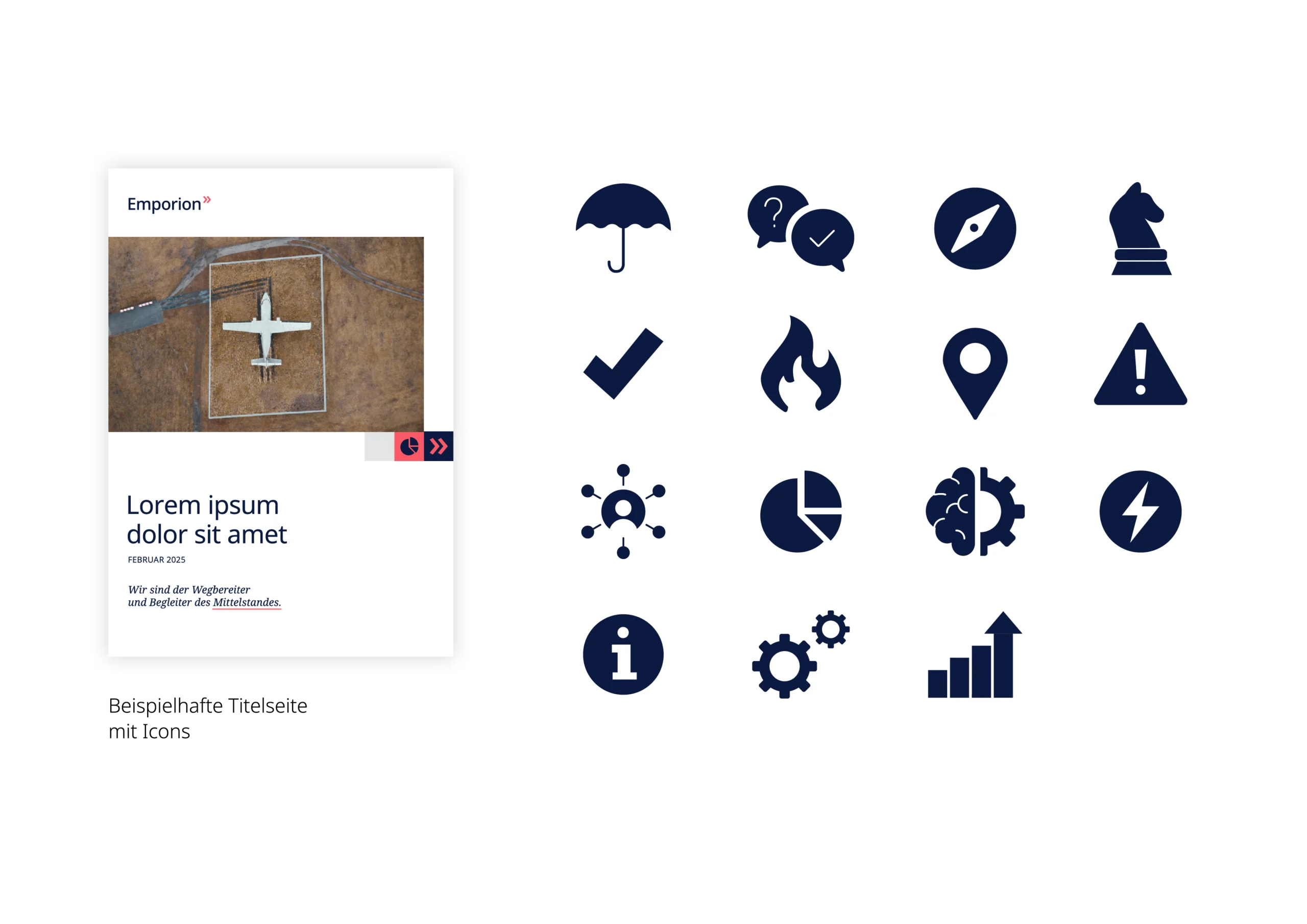 Für Emporion werden in Anlehnung an das Logo vollflächige (Solid) Icons mit einer hohen Plakativität und einem stark reduzierten Detailgrad verwendet. Die Verwendung von Vektordaten aus Bilddatenbanken wie Freepik und Flaticon sollten so erfolgen, dass der Stil möglichst einheitlich ist. Die Icons sollten untereinander konsistent sein.