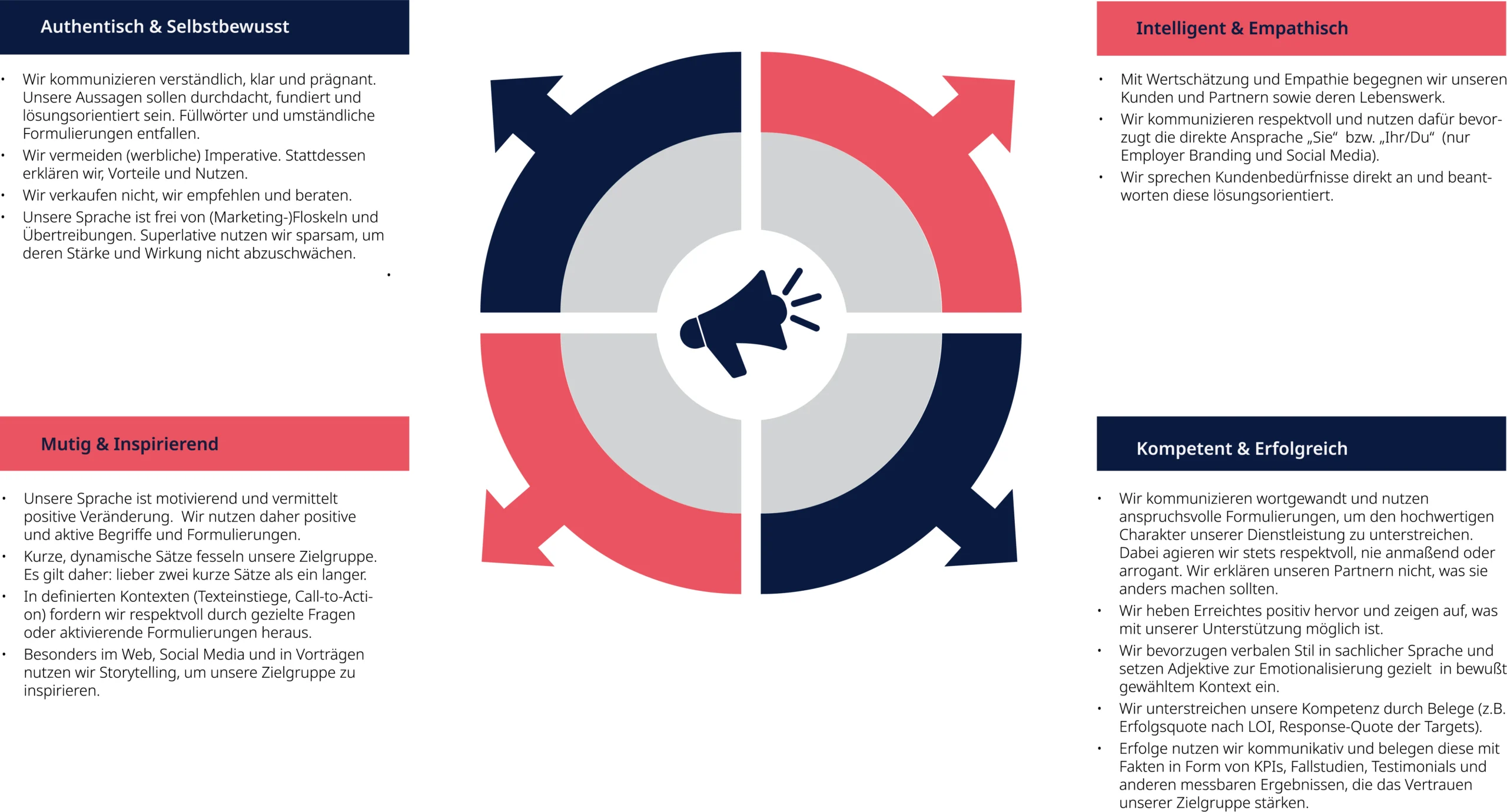Der Tone of Voice beschreibt, wie wir als Marke auf sprachlicher Ebene mit unseren Zielgruppen und Stakeholdern kommunizieren. Diese Ebene der Markenpersönlichkeit äußert sich bspw. durch Terminologien und Worte, mit denen wir uns in Briefen und Anschreiben auf unserer Website, in Social Media oder in anderen Kanälen ausdrücken.